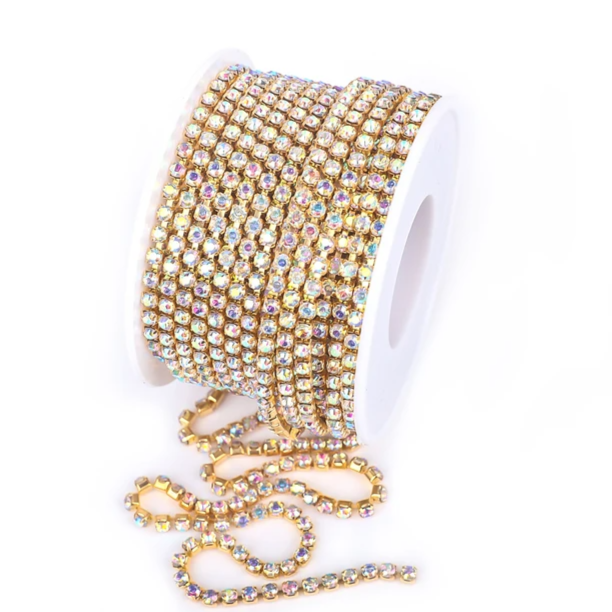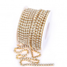 Универсальный декор представляет собой металлическую цепочку золотого цвета со стразами диаметром 2,5 мм. Может применяться для декорирования предметов одежды и обуви, домашнего декора, при изготовлении игрушек, в скрапбукинге и декупаже. Очень красиво переливается.