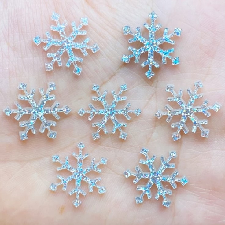 Симпатичный декор из акрила в виде прозрачный блестящих снежинок. Продается в упаковке по 10 штук. Микс из двух разных видов снежинок в одной упаковке. Плоская задняя поверхность (кабошон)