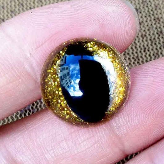 Безопасные глаза для игрушек. Объемные из прозрачного акрила с черным вытянутым зрачком как у кошки (змеи, дракона и тд.). На винте. в комплект входит цветная блестящая радужка золотого (желтого) цвета. В упаковке 2 штуки (1 пара).
